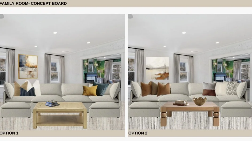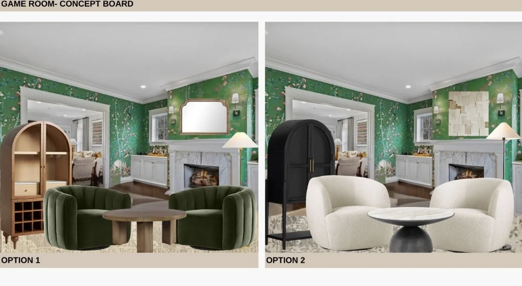 For Howi and Dandi’s project, we created a series of concept boards tailored to their home in Greenwich, CT — an eclectic yet contemporary family retreat. Each space was given multiple style options so they could visualize the final look without waiting for full renders, blending individuality with a cohesive overall flow.